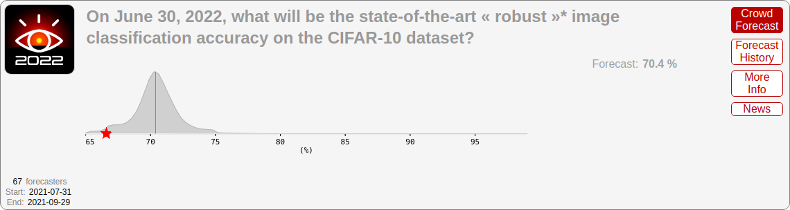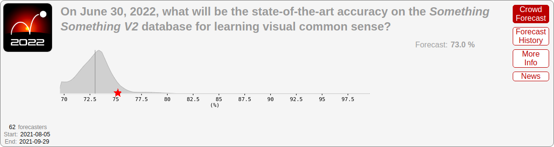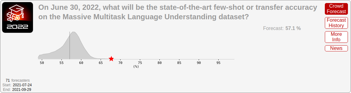 For June 2022, forecasters predicted 12.7% on MATH, 57.1% on MMLU (the multiple-choice dataset), 70.4% on adversarial CIFAR-10, and 73.0% on Something Something v2.
