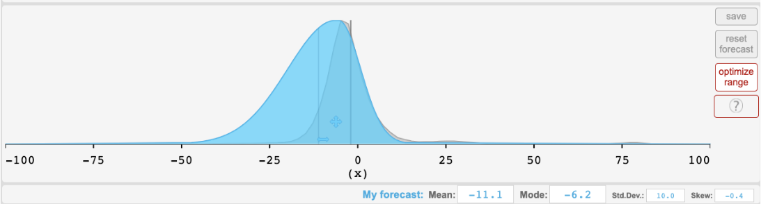 - Hypermind’s interface has some limitations that prevent outputting arbitrary probability distributions. In particular, in some cases there is an artificial limit on the possible standard deviations, which could lead credible intervals to be too narrow.