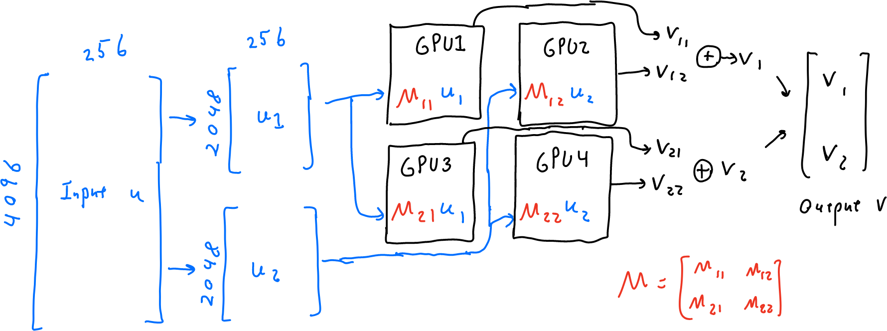 Pretty much all the work here happens in step (2.). In this step, each machine must receive and send a 2048 x 256 vector (~2MB total), read or write matrices of size 2048x256, 2048x2048, and 2048x256 (~10MB), and run 2048x2048x256 add-multiply operations (~2GFLOPs). For the same hardware specs as before, this comes out to 5μs for communication, 6μs for memory, and 6μs for computation. Relative to the 25μs/layer from before, we’ve achieved a 4x speed-up due to parallelizing across 4 GPUs.