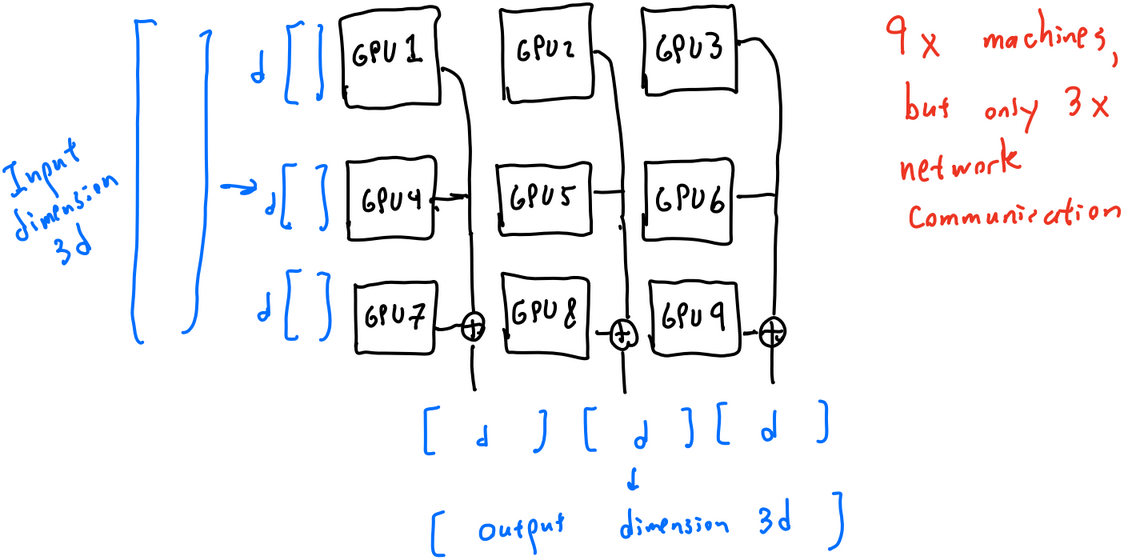 To sanity check the block tiling scheme above, on an 8xA100 machine the blocks would be 1024x1024 (rounded to the nearest power of 2). Since the dimensionality of many models is around 8192-16384, this means the computation would have to be split across 64-256 machines or 512-2048 total GPUs. This is within the range of possibility, e.g. TPUv4 has 4096 GPUs per node.