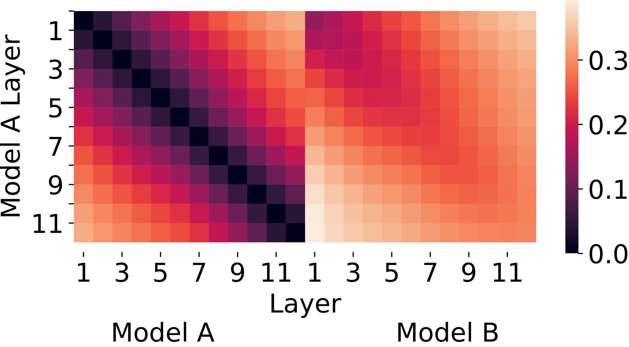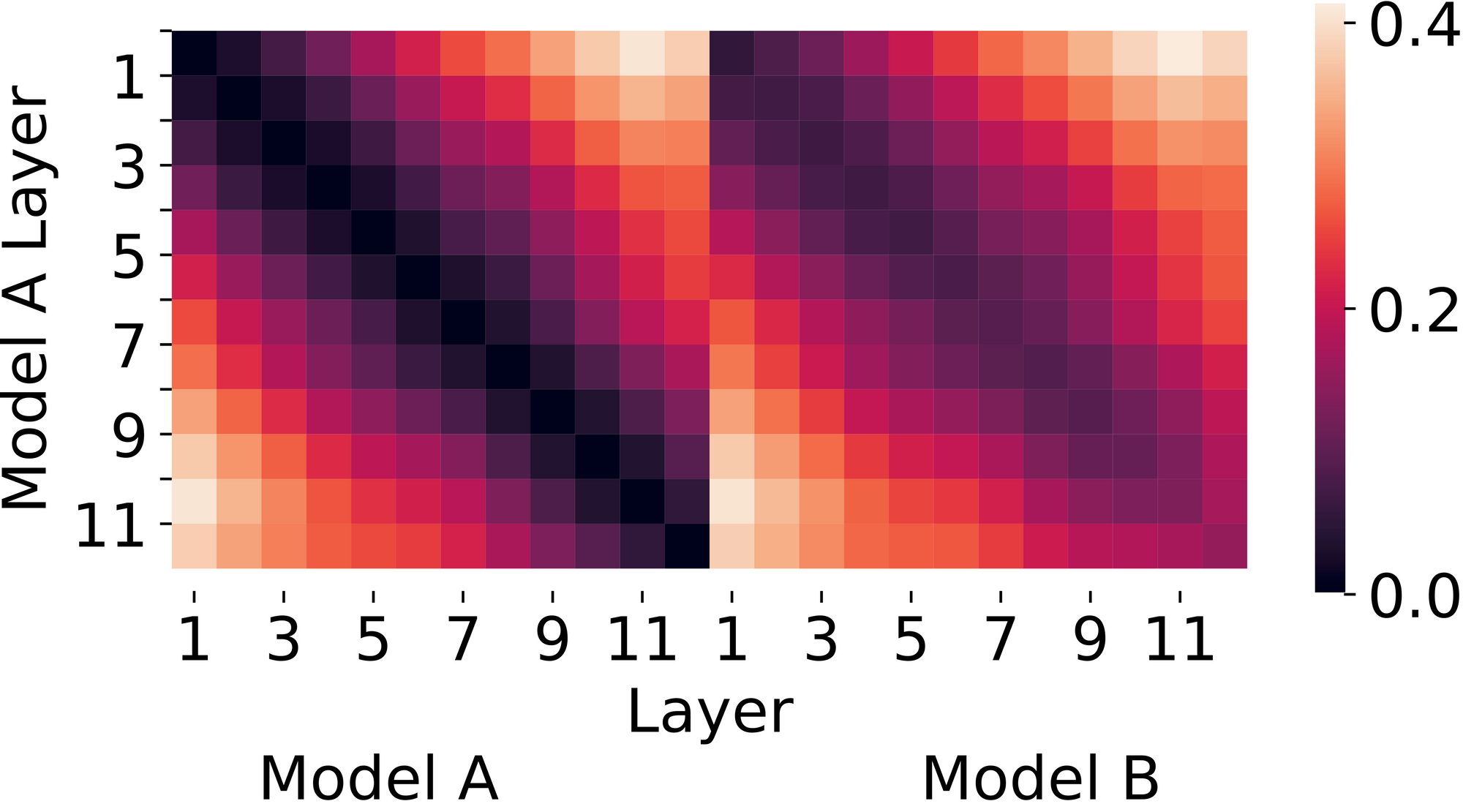 Figure 1. CKA (Centered Kernel Alignment) similarity between two networks trained identically except for random initialization. Lower values (darker colors) are more similar. CKA suggests that the two networks have similar representations.