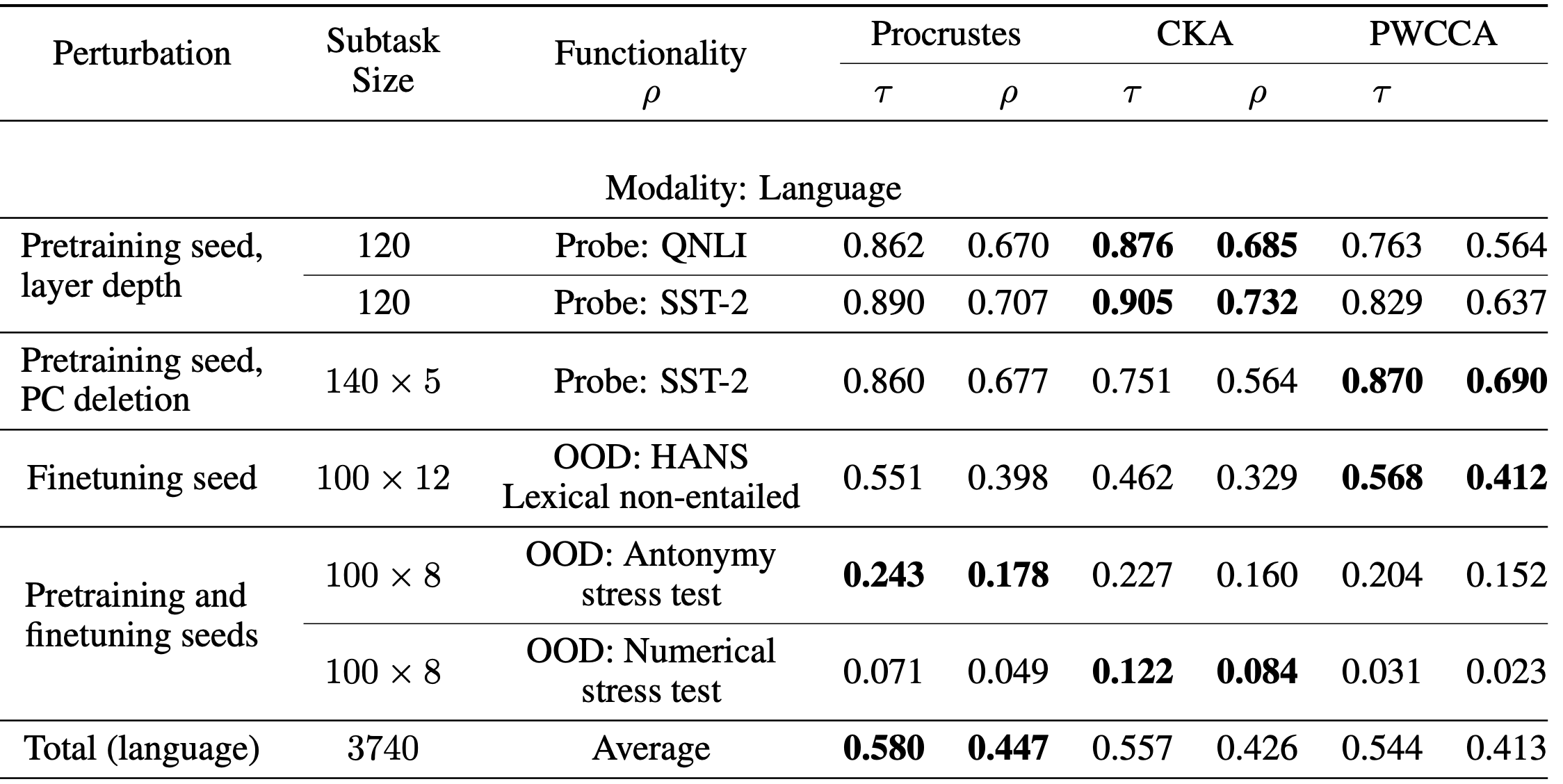 The table below shows our results with BERT language models (vision model results can be found in the paper). In addition to the popular CKA and (PW)CCA metrics, we considered a classical baseline called the Procrustes distance. Both CKA and PWCCA dominate certain benchmarks and fall behind on others, while Procrustes is more consistent and often close to the leader. In addition, our last subtask is challenging, with no similarity measure achieving high correlation. We present it as a challenge task to motivate further progress for similarity metrics.