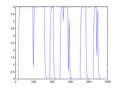 > %% generate data > > a = 0.8; b = 1.0; > > N = 1000; > > ntape = 1:N; y = zeros(N,1); u = zeros(N-1,1); > > for n=1:N-2 > > if rand < 0.02 > > u(n+1) = 1-u(n); > > else > > u(n+1) = u(n); > > end > > end > > for n=1:N-1 > > y(n+1) = a*y(n)+b*u(n); > > end > > plot(ntape,y); > > %% least squares fit (map y(n) and u(n) to y(n+1)) > > A = [y(1:end-1) u]; b = y(2:end); > > params = A\b; > > afit = params(1) > > bfit = params(2)