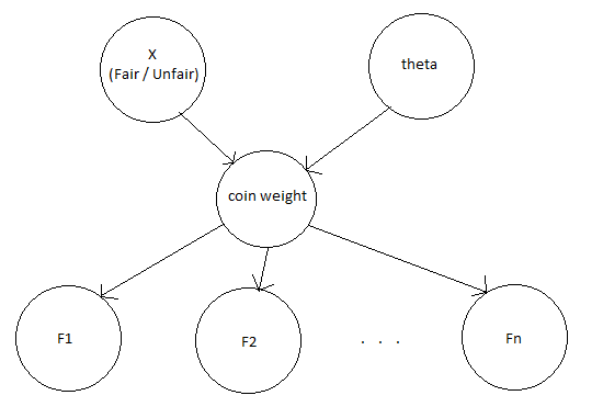 Continuing, if F1, F2, ..., Fn are the flips of the coin, then p(Fi = Heads | X = Fair, Weight = $\theta$) = $\theta$.