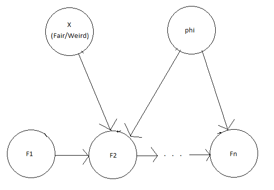 To predict the actual coin flips, we get p(F1 = Heads | X = Weird, Switching probability = $\phi$) = 1, p(F(i+1) = Heads | Fi = Heads, X = Weird, Switching probability = $\phi$) = $1-\phi$, and p(F(i+1) = Heads | Fi = Tails, X = Weird, Switching probability = $\phi$) = $\phi$. We can represent this all with the following graphical model:
