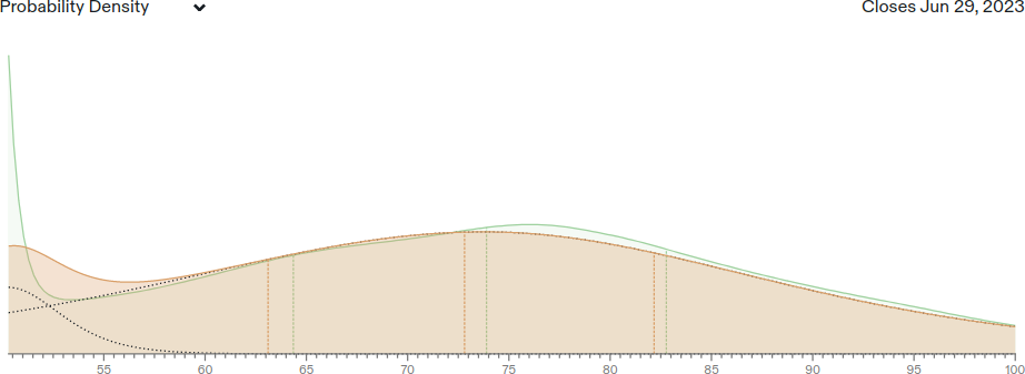 For reference, I include full Metaculus forecast below as a probability density function; note the x-axis is truncated on the left.