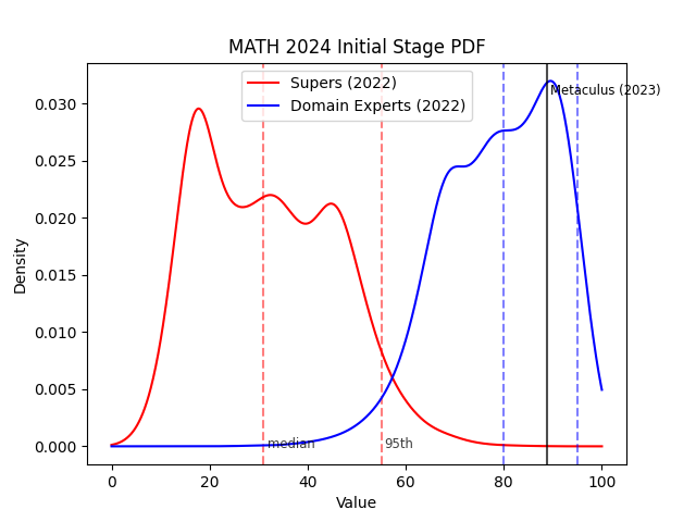 Here are the distributions for both the superforecasters and AI domain experts on MATH and MMLU accuracy in 2024, with their median and 95th percentile indicated below the plot. I've also included the Metaculus median forecast (as of August 2, 2023) for reference.