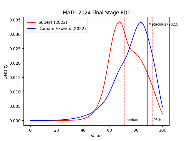 I also happened to register forecasts for 2024 on MATH around the same time, and I had a very similar median to the AI experts (80.7% vs 80%). However, my 95th percentile was at 97.5% instead of 95%; Metaculus assigns only 7% probability to MATH resolving beyond this point, so my own forecast stands up better than either the superforecasters or AI experts. I believe this is primarily due to having practiced calibration more, as most novice forecasters underestimate how wide a 95% confidence interval needs to be.
