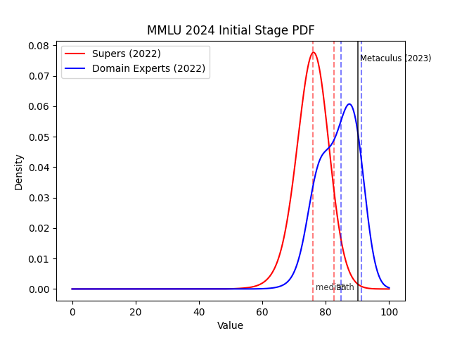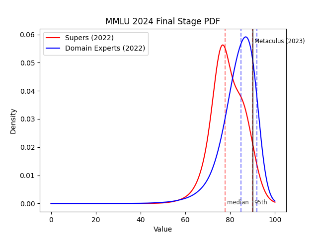 In contrast, Metaculus assigns about 15% probability to MATH resolving beyond the 95th percentile domain expert prediction, and 30% probability to MMLU doing so. This is despite the fact that the AI experts had a narrower prediction interval than the superforecasters (e.g. as measured by the gap between the median and 95th percentile). So, the AI experts look better than the superforecasters.