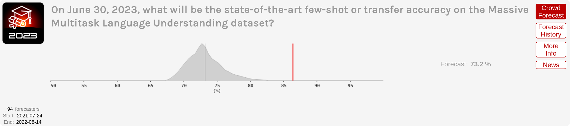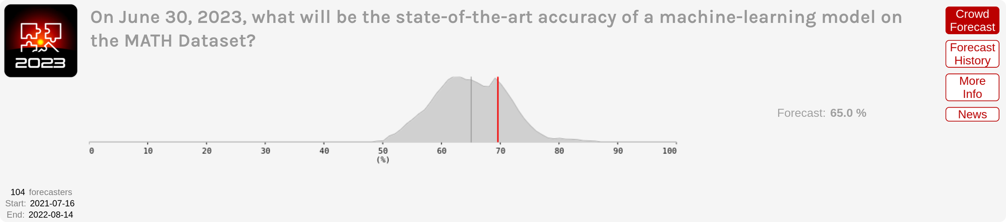 As a reminder, forecasts are specified as probability distributions over some (hopefully unambiguously) resolvable future outcome. In this case the outcome was the highest credibly claimed benchmark accuracy by any ML system on the MATH and MMLU benchmarks as of June 30, 2023.[1]